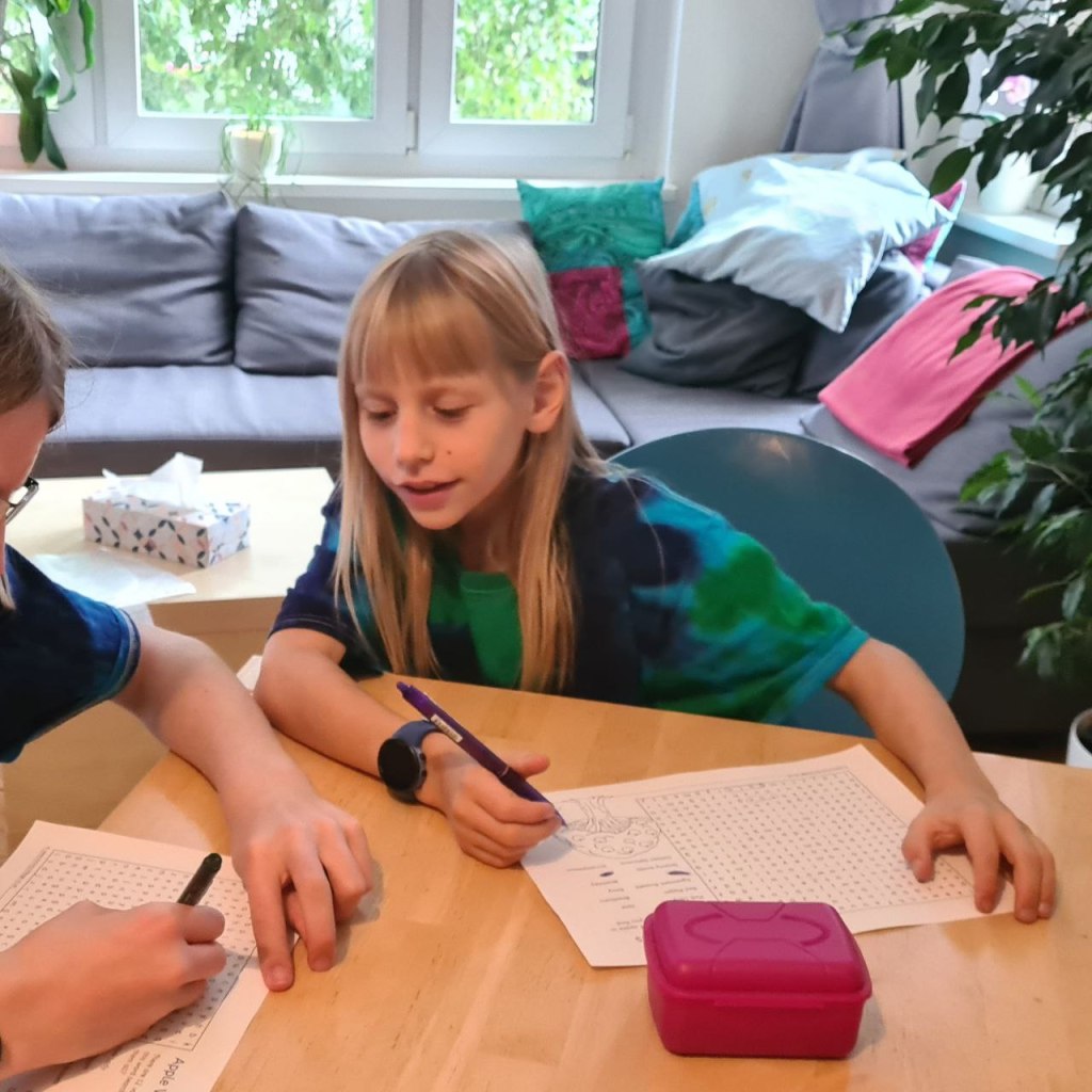 This is a meetup for readers ages 7 to 10. The kids do a variety of different activities with the group leaders – projects may include reading and presenting their favorite stories, jokes and poems, designing and drawing their own comics, and playing simple role-playing games together. Kids in this group are able to read full sentences in either German or English (typically they have completed 1st grade in a German school, but we have had 1st graders in the class who are strong readers).